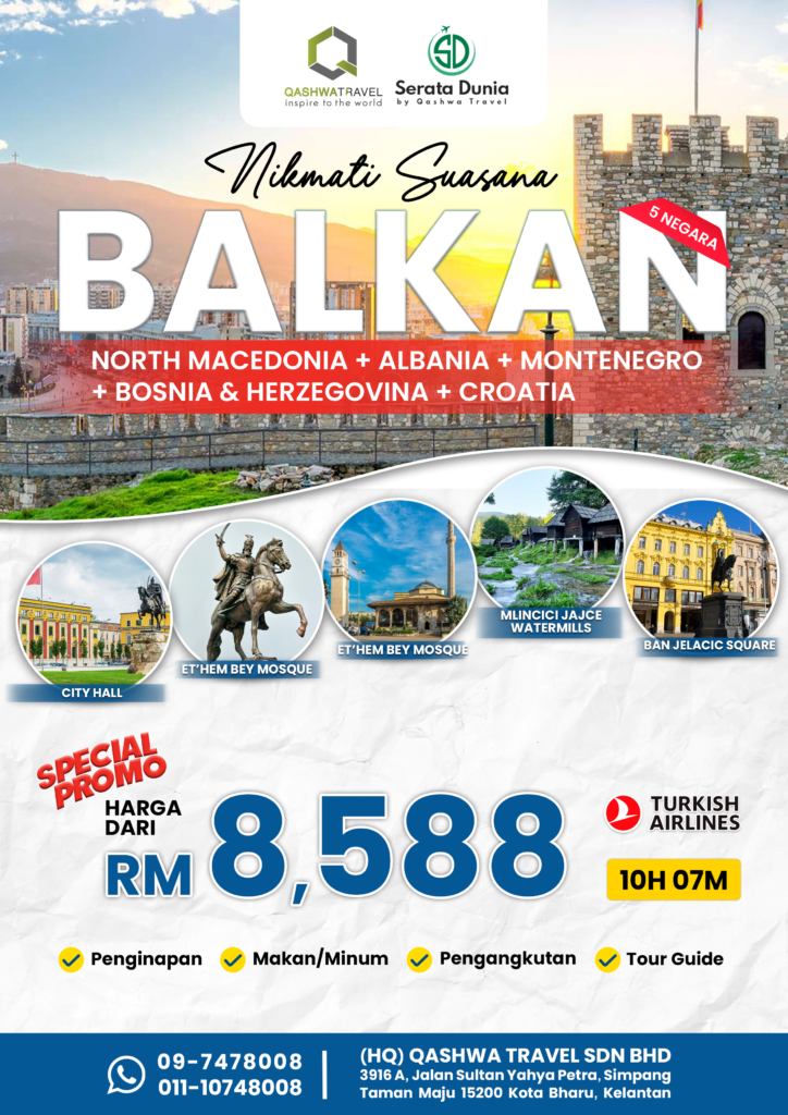 Percutian di lima negara Balkan – North Macedonia, Albania, Montenegro, Bosnia & Herzegovina dan Croatia yang menyimpan pelbagai khazanah sejarah dan landskap pemandangan yang mengagumkan. Percutian yang tentunya menjanjikan penerokaan tempat-tempat menarik kepada anda.